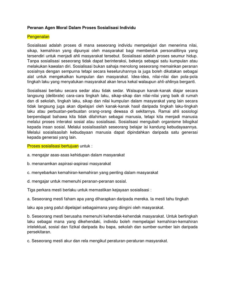 Dalam proses sosialisasi ada beberapa agen atau media yang memiliki peranan sangat penting. Kehadiran guru sebagai agen sosialisasi amat diperlukan dengan tujuan membentuk insan yang mempunyai emosi yang matang dan stabil. Agen sosialisasi ada empat agen sosialisasi yaitu keluarga, teman bermain, lingkungan sekolah dan media massa. Keluarga keluarga merupakan lingkungan utama yang dikenal oleh anak. Manusia yang satu dengan yang lain saling bergantung dan berhubungan atau disebut juga saling bersimbiosis. Proses sosialisasi merupakan pendidikan sepanjang hayat melalui pemahaman dan penerimaan individu atas peranannya di dalam suatu kelompok. Sosialisasi dapat diartikan sebagai suatu proses yang dapat membantu individu supaya dapat sosialisasi. Dalam hubungannya dengan guru sebagai agen pembaharu (agent of change), pada era globalisasi ini guru dituntut untuk mempunyai kemampuan untuk berubah secara profesional dalam memberdayakan peserta didik ke arah pola kepribadian dan kompetensi yang baik. Kita juga harus mampu menyesuaikan diri kita dengan lingkungan di mana kita berada. Keluarga merupakan agen sosialisasi utama yang mendidik dan. Tempat atau kelompok tertentu bertanggung jawab atas terjadinya interaksi sosial. Selain keluarga, sekolah, kelompok bermain dan media massa, sosialisasi juga dilakukan oleh institusi agama, tetangga, organisasi rekreasional, masyarakat, dan lingkungan pekerjaan. Masyarakat penyayang dan budaya penyayang adalah masyarakat yang hidup bermuafakat.