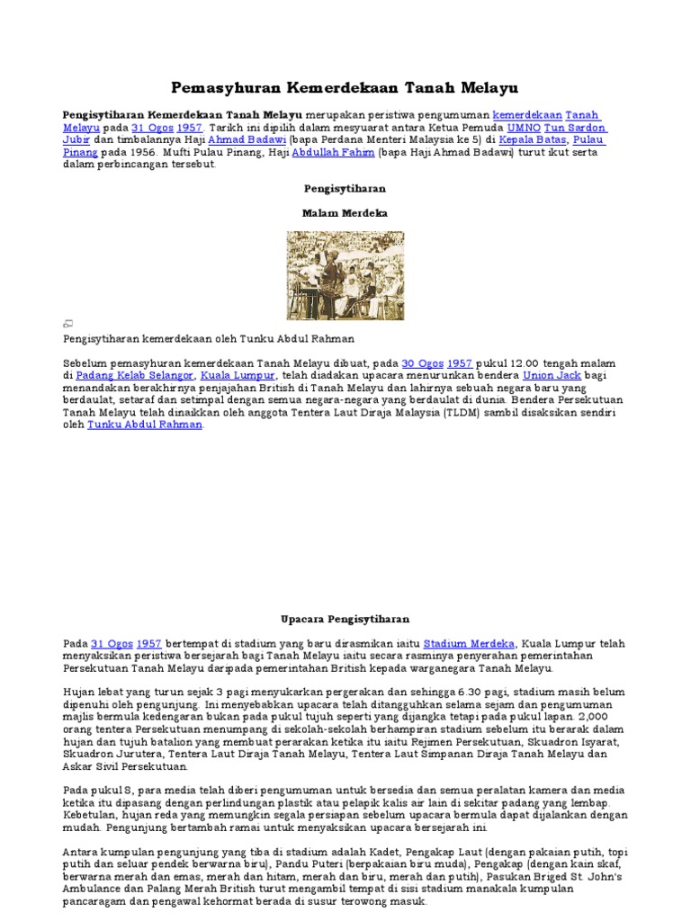 Tugu negara kapal sejarah kota a'famosa muara sungai. Dan tiga hari berselang bom atom juga dijatuhkan di kota nagasaki. Terjawab • terverifikasi oleh ahli. Blog sejarah tingkatan tiga, bab lima. Perjuangan kemerdekaan fasa iii dan seterusnya. Malaysia merupakan tetangga indonesia, singapura, brunei darussalam dan thailand. Contohnya umno, mca dan mic. Sebelum diambil alih jepang, sawarak dan borneo utara adalah wilayah protektorat inggris. Pemasyhuran kemerdekaan telah dilaksanakan dengan penuh gilang gemilang di stadium merdeka, kuala uniknya, stadium tersebut hanya siap dibina sehari sebelum pemasyhuran kemerdekaan diadakan. 31 ogos merupakan detik yang amat penting buat negara kita. Sebelum itu juga british telah menjadikan tanah melayu sebagai malayan union pada 1946. Kumpulan ini tidak sempat menyiapkan laporan mereka sebelum 31 ogos 1963 untuk membolehkan perisytiharan kemerdekaan. Pemasyhuran kemerdekaan telah dilaksanakan dengan penuh gilang gemilang di stadium uniknya, stadium tersebut hanya siap dibina sehari sebelum pemasyhuran kemerdekaan diadakan.