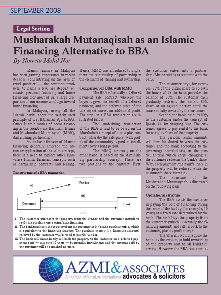 The 2 major flavours of islamic home financing in malaysia are the bba and mm genres. Aif focuses on developing human capital across the financial services industry in asia. Less popular are facilities based on musyarakah mutanaqisah (mm). Md nor, mohd zakhiri (2010) preparing legal documentation for musyarakah mutanaqisah financing facilities. In malaysia also, this concept is popular and it showed that at the kuala lumpur high court alone, 90% of the 3,200 muamalat cases 1.